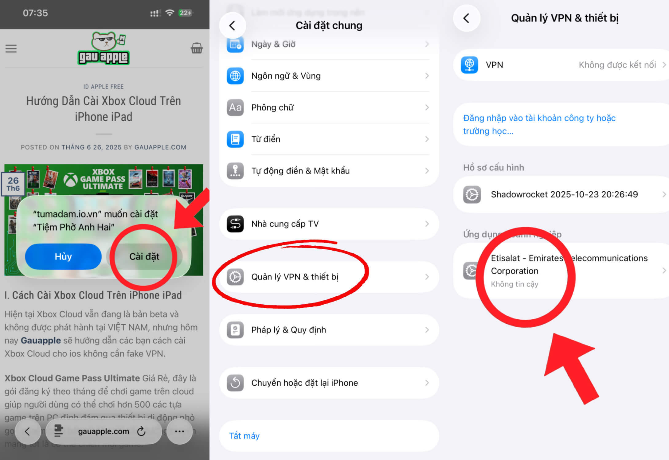 Bước 2: Mở Cài đặt – Cài đặt chung – Quản lý VPN và thiết bị – Cho phép chạy cấu hình vừa tải về.